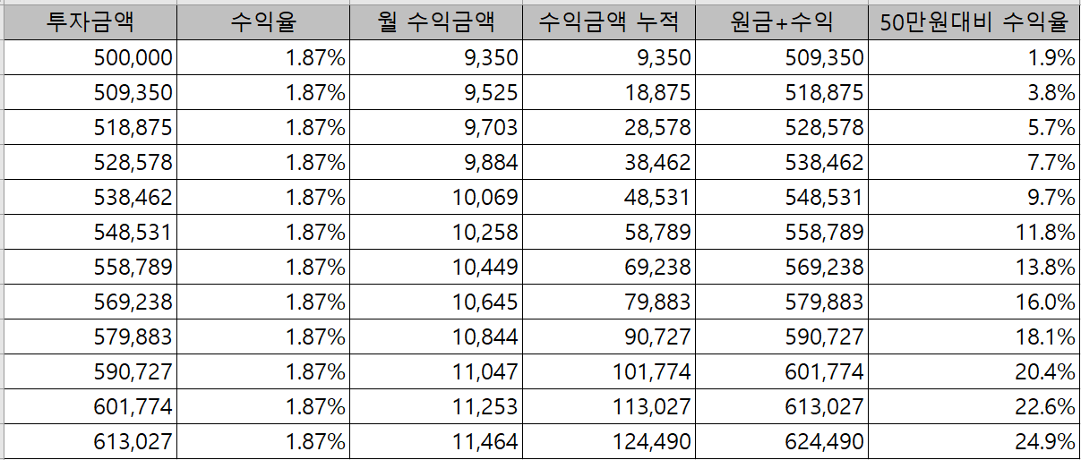총 투자금액 50만원으로 환산해보니 월 1.87%수익이다.