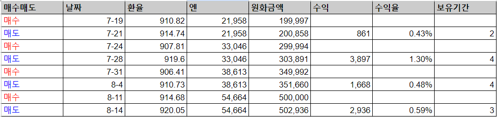 7/19~8/14 매매 기록 그래서 50만원으로 한달이라는 시간동안 실제로 일본 엔화 투자로 얼마나 벌리는지 검증하는 시간을 가져봤다.